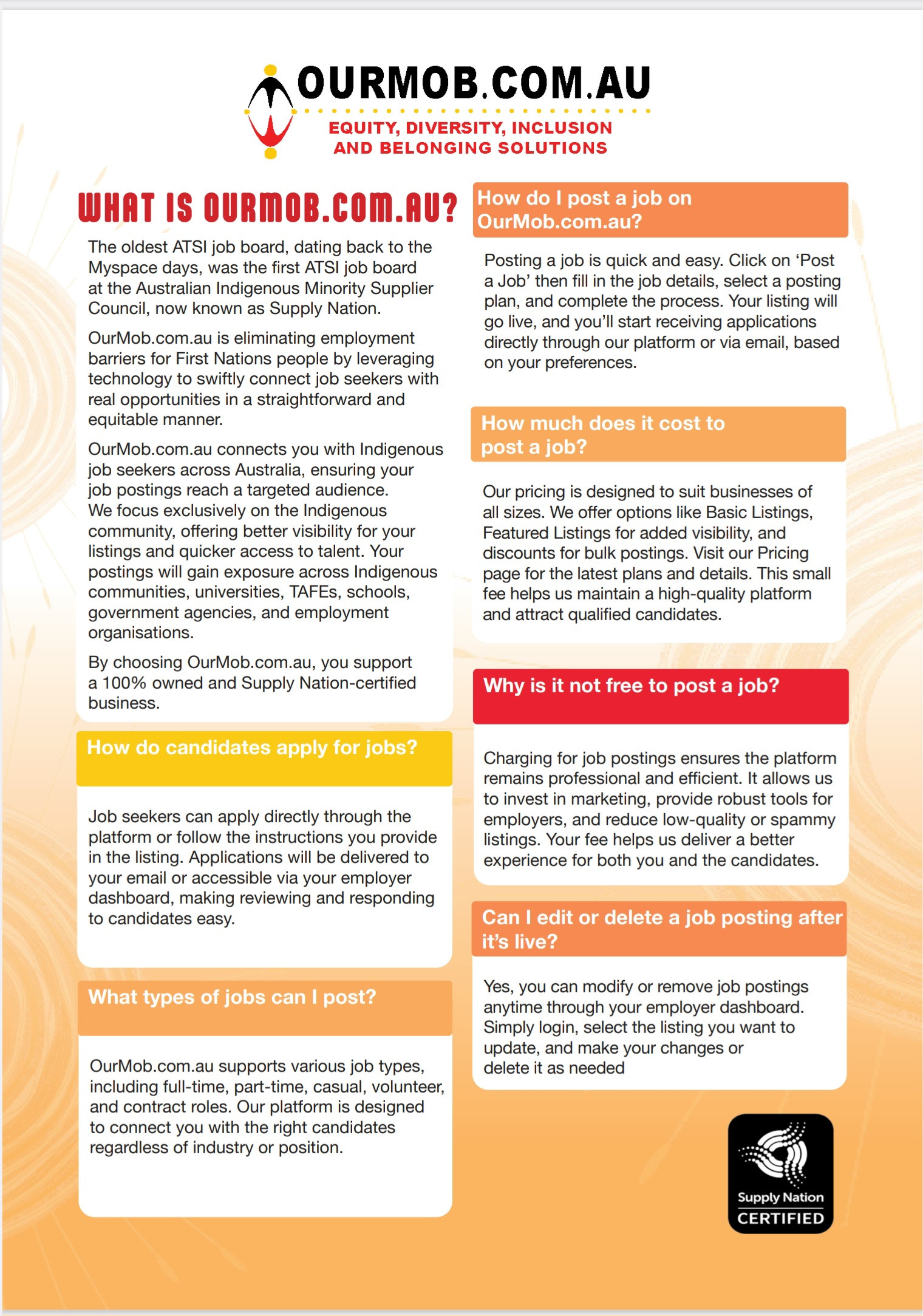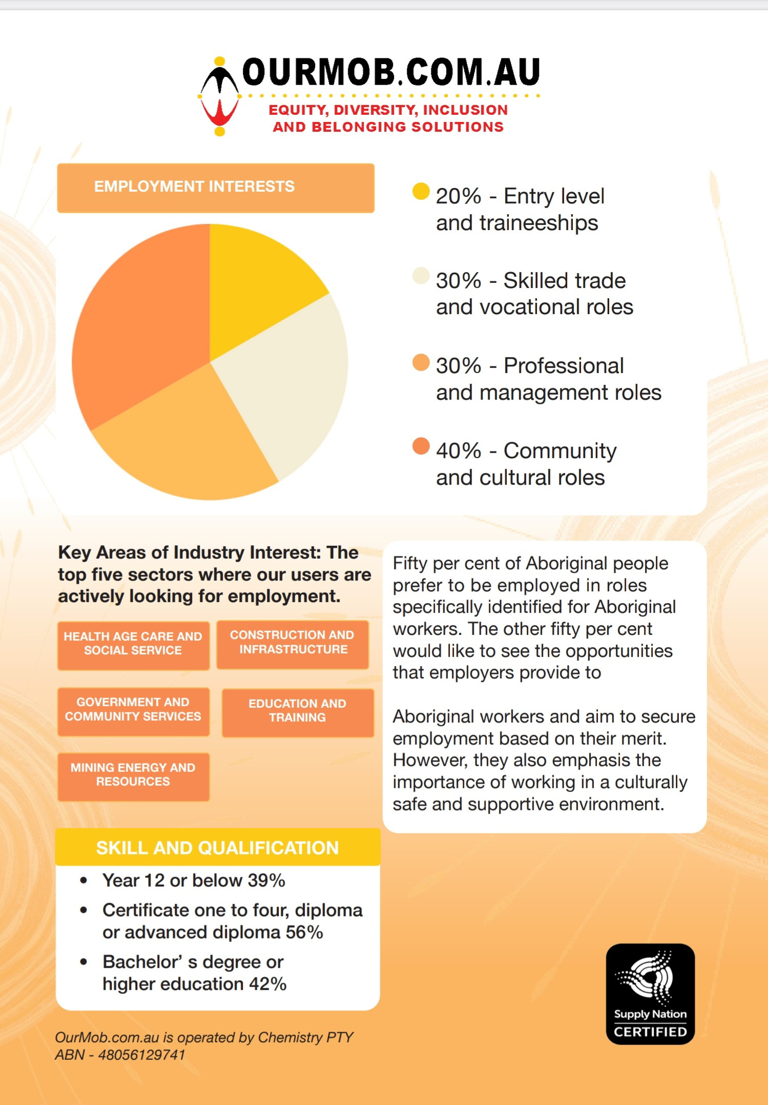 OurMob.com.au/ Chemistry PTY Limited is Supply Nation certified and compliant with the Department of Prime Minister and Cabinet- Indigenous Procurement Policy (IPP) on 1 July 2015 - Commonwealth Procurement Rules. The IPP allows Commonwealth buyers to purchase directly from Indigenous small to medium enterprises for contracts of any size and value using the Indigenous business exemption (17).